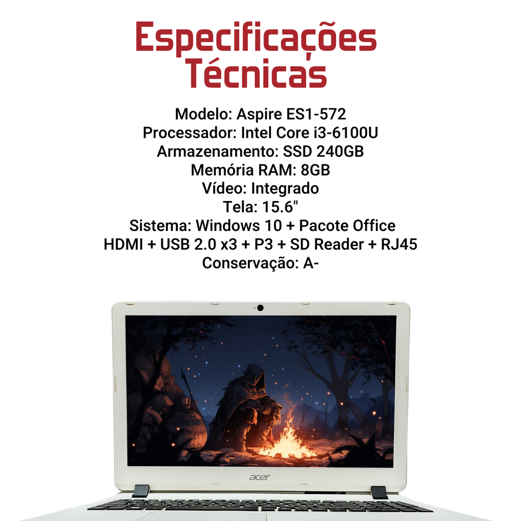 Acer Aspire ES1-572 - Intel Core i3-6100U, 8GB RAM, 240GB SSD, Tela 15.6", Windows 10 + Pacote Office